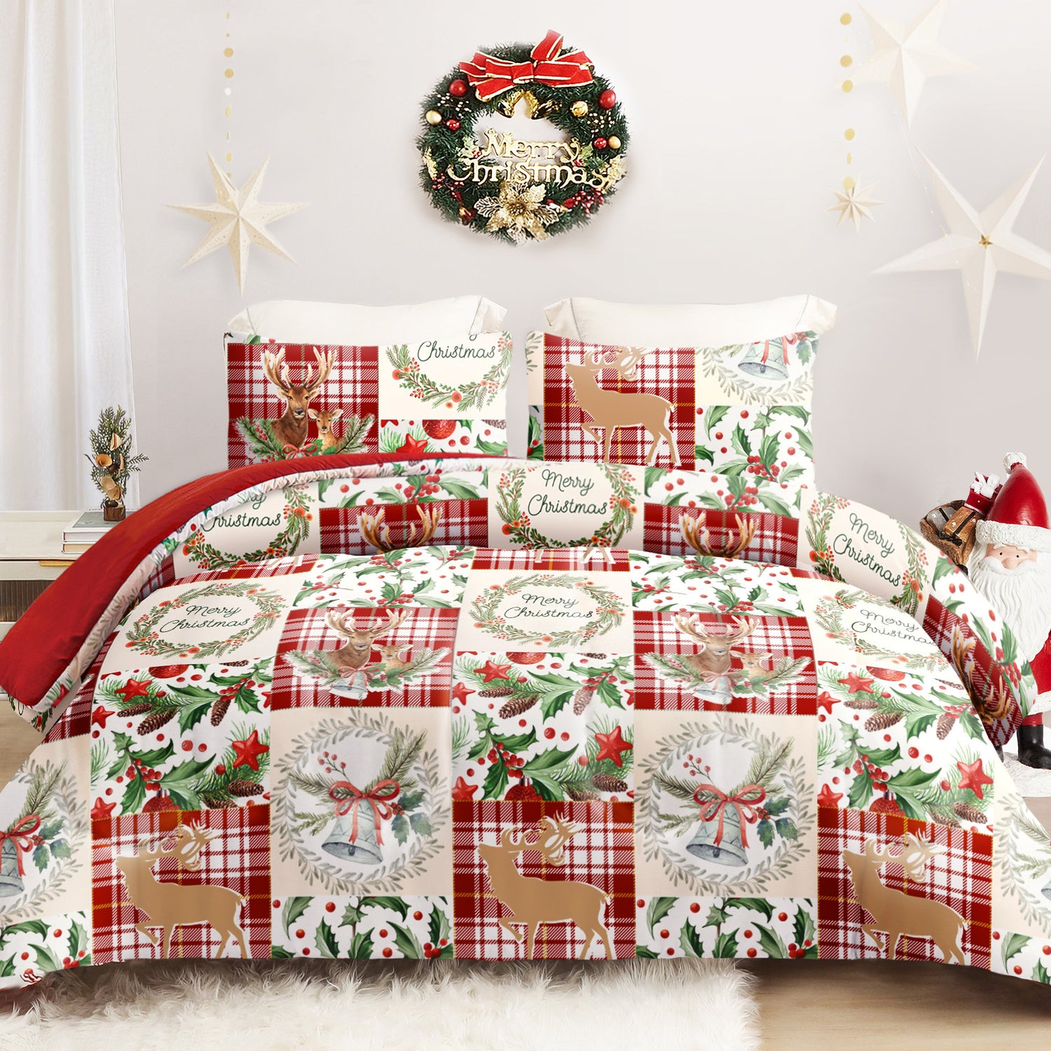 Exclusivo Mezcla Christmas King Size Comforter Set, 3 Pieces Reversible Rust Red Patchwork Bedding Comforters, Printed Reindeer Wreaths Pattern